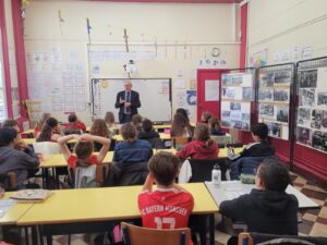 Les élèves de CM1 et CM2 ont accueilli dans leur classe le président des Anciens combattants de Marly, M Joël BOUTE et le président du Musée de la Mémoire, M Stéphan ALAIN. Durant toute une matin, ils ont échangé sur la Seconde guerre mondiale, à partir d’images d’archives. Les élèves ont aussi pu manipuler plusieurs objets d’époque :casques, uniforme, gourdes, médailles… Une belle matinée de transmission…pour ne pas oublier.